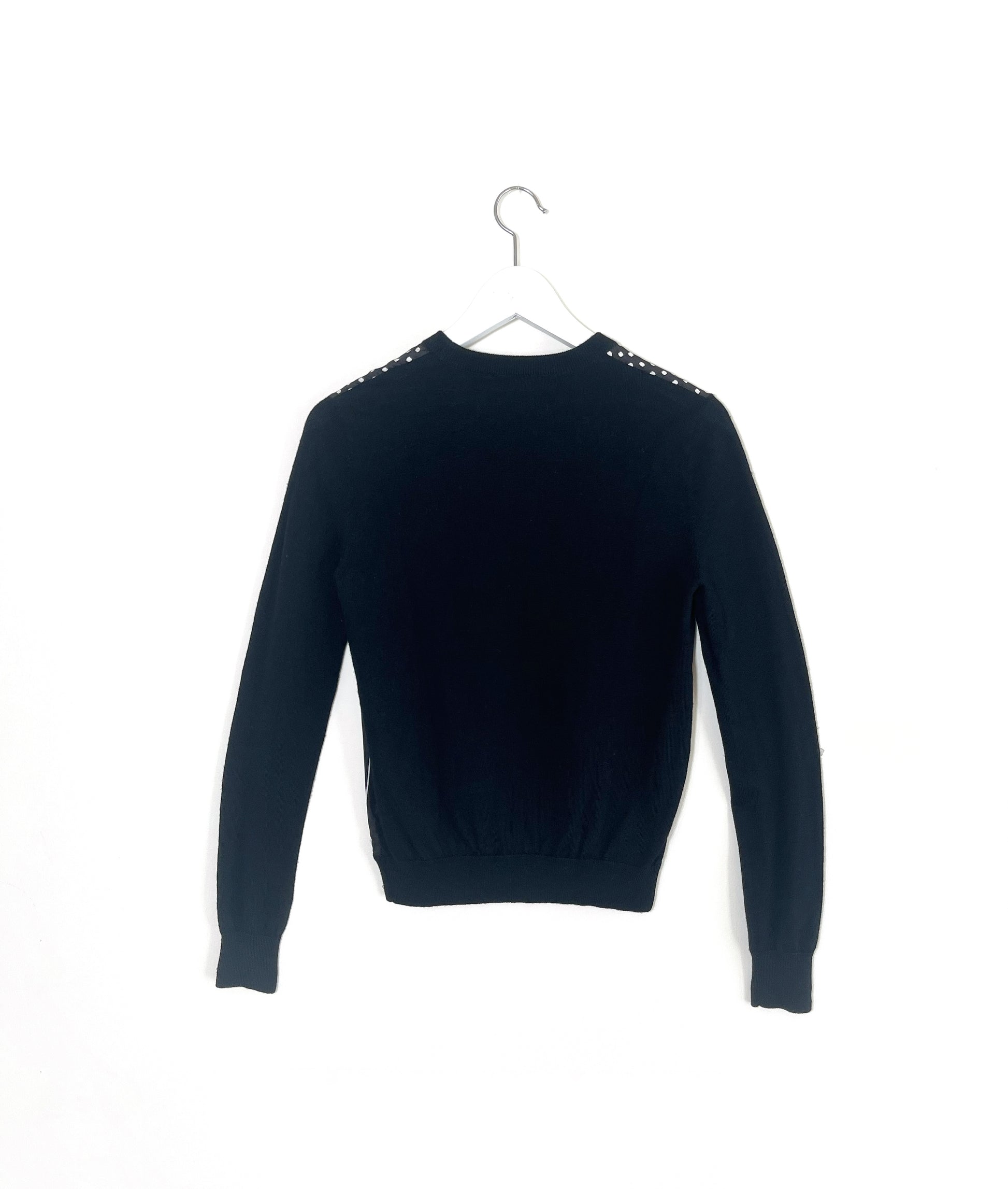 パリのデザイナーズブランド〈Carven〉による、シックなブラック×ホワイトのプルオーバーニットトップ。袖と背面はミドルゲージのニット素材、表面は端正なストライプとさりげないドットが描かれたシルク生地で切り替えられたシンプルながらも遊び心を忘れない乙女のようなトップス。元気な出ない日や、ここぞ、という日にぴったりです。
