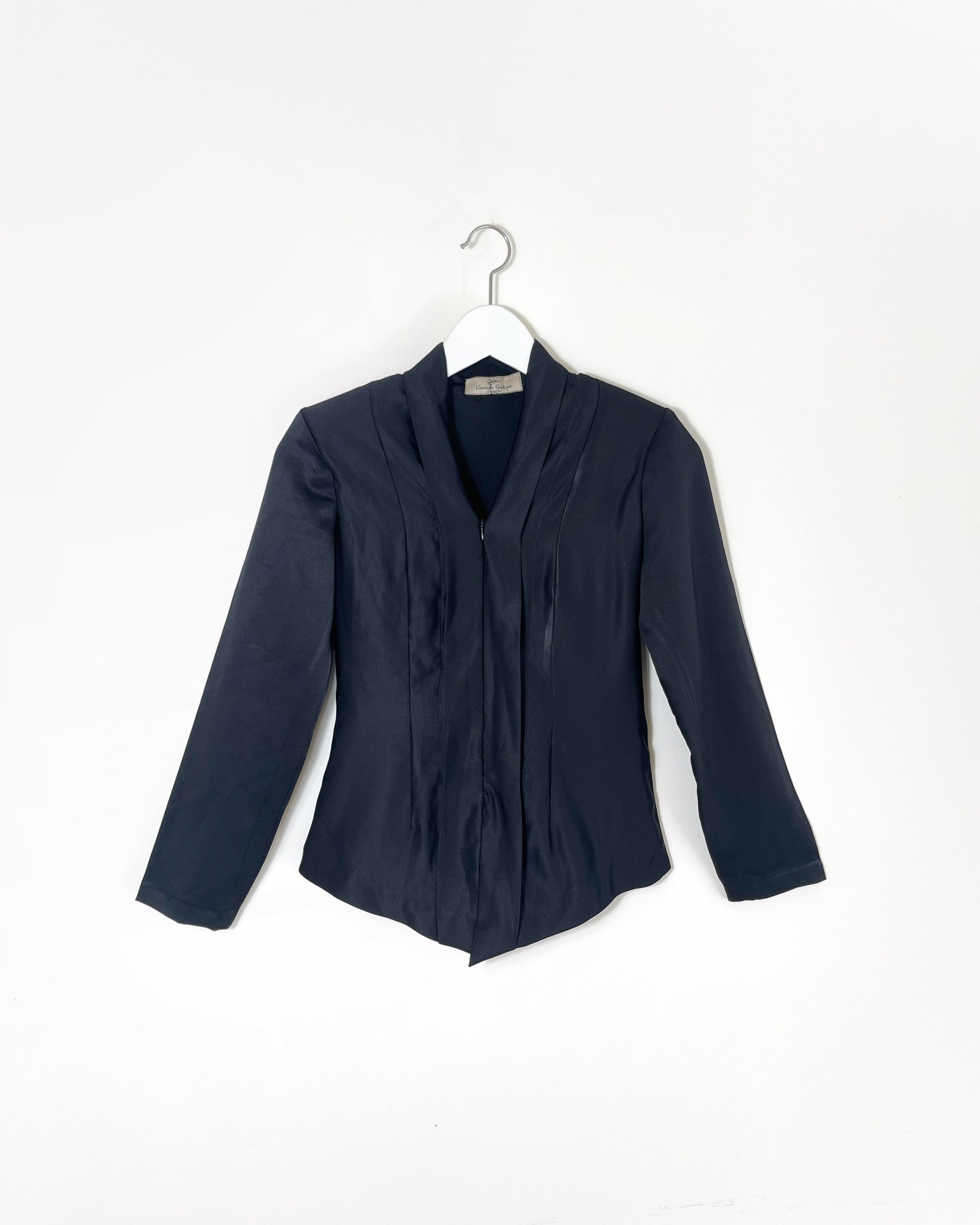 テイラードの美しさとブラウスの軽やかさを一枚に。光沢感のある生地と立体的なパターンによって体に沿うように仕立てられたブラウス。フロントのジップがおへそあたりまで開く仕様のため、腰回りがもたつかず、すっきりとしたシルエットを叶えます。頭からすっぽりかぶって着用いただくアイテムです。Vネックが首回りを、特徴的なV字の裾がウエストラインをシャープに見せてくれます。デニムと合わせても、スラックスと合わせても。
