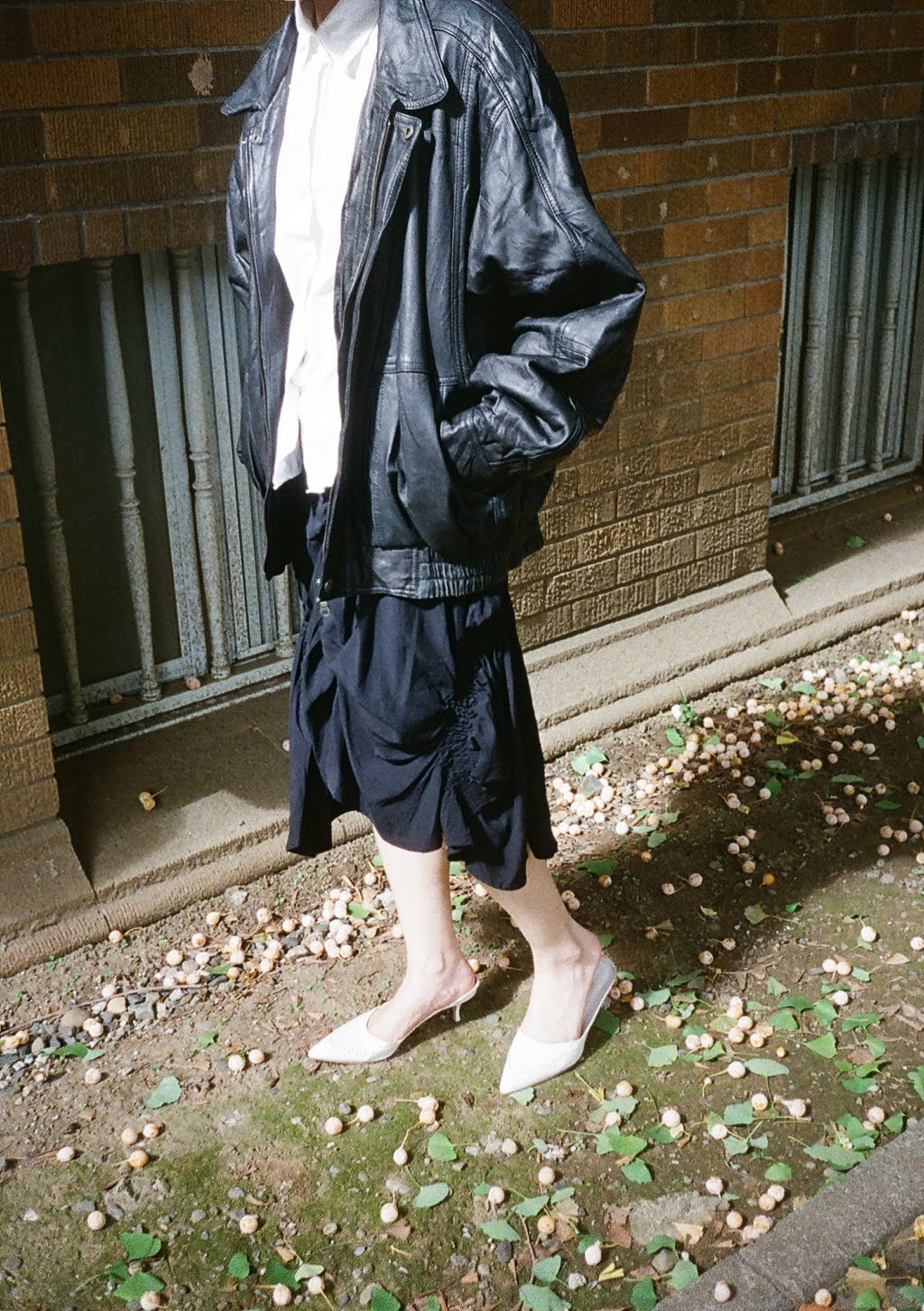90年代のポインテッドホワイトミュール。何十年も愛されてきた定番のミュール。ホイップスティッチが特徴的なアイテム。