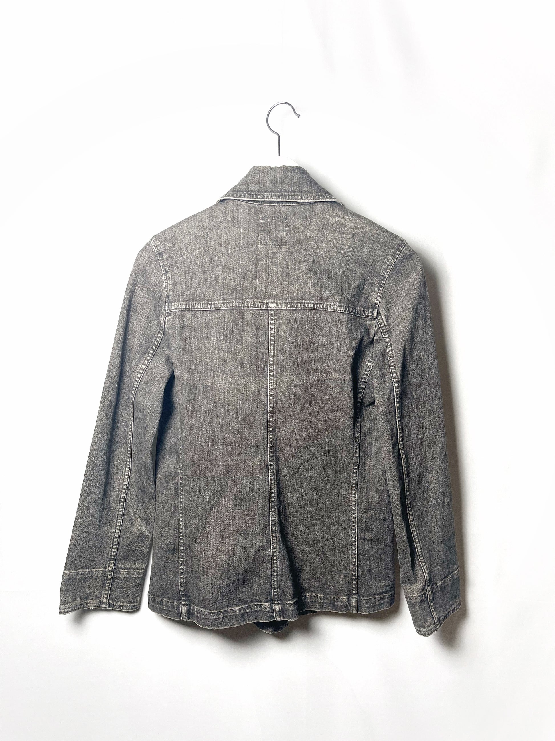 ダブルのデニムジャケット。コンパクトなシルエットがミニマルで洗練された印象です。襟元のフックがワンポイントで効いています。