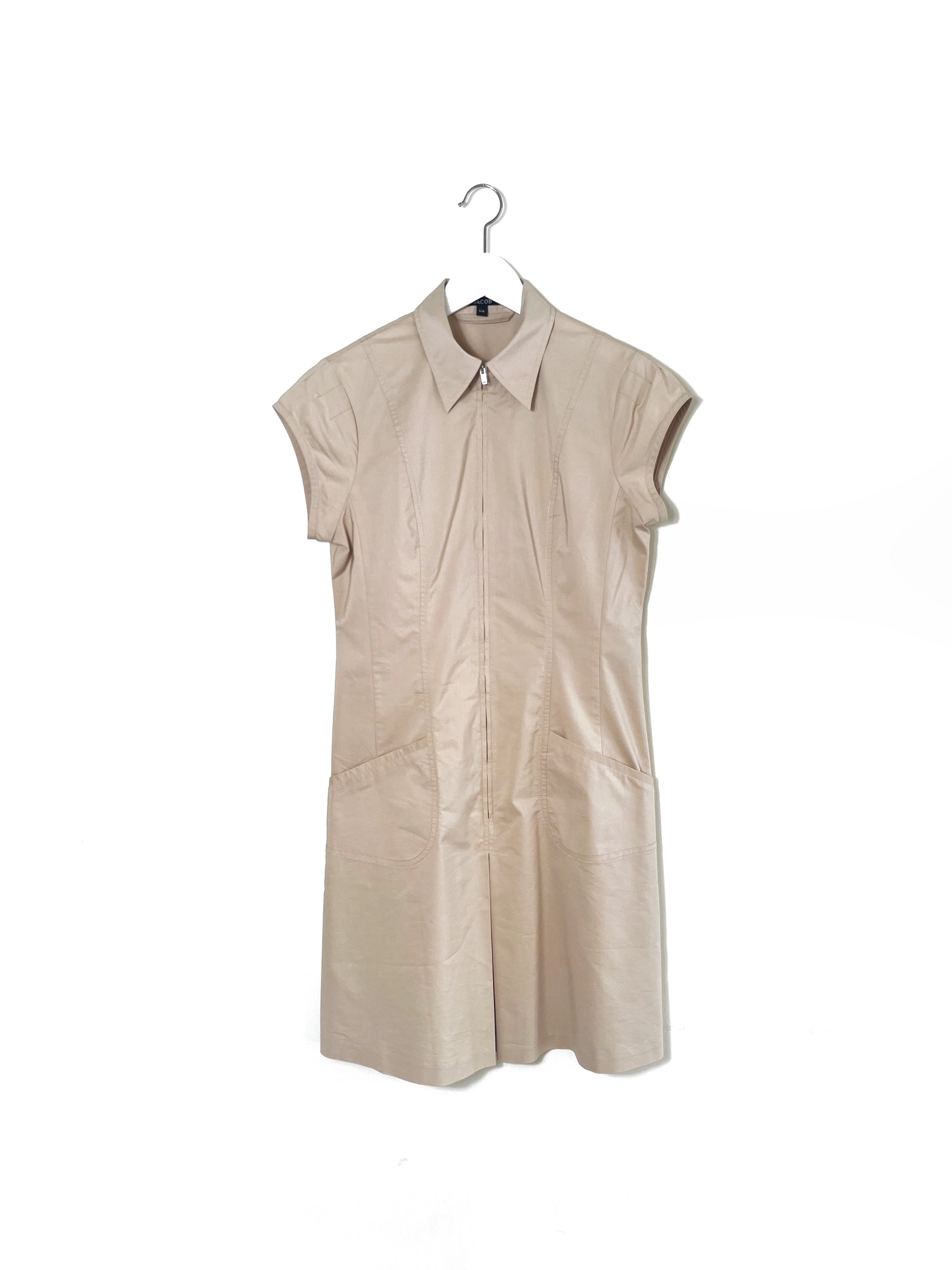シンプルで洗練されたデザインが魅力の半袖ワンピース。シャープな襟と、フロントジップ、控えめなフレンチスリーブが可愛らしさを加えています。インバーテッドプリーツ仕立てでクラシカルな雰囲気と、機能性を兼ね備えています。ベルトをつけるとまた違った印象に。さまざまなシーンで使用していただけるアイテムです。