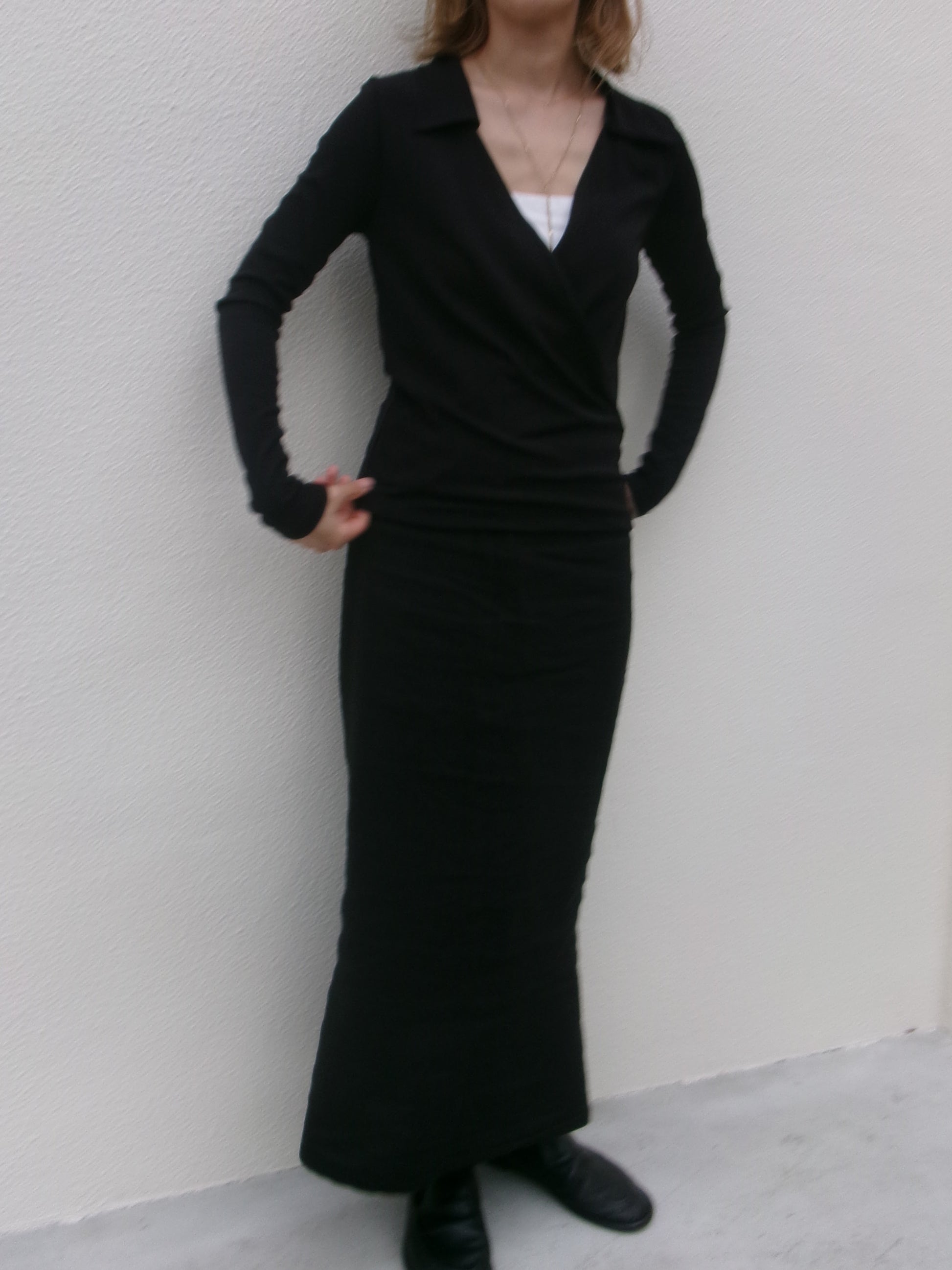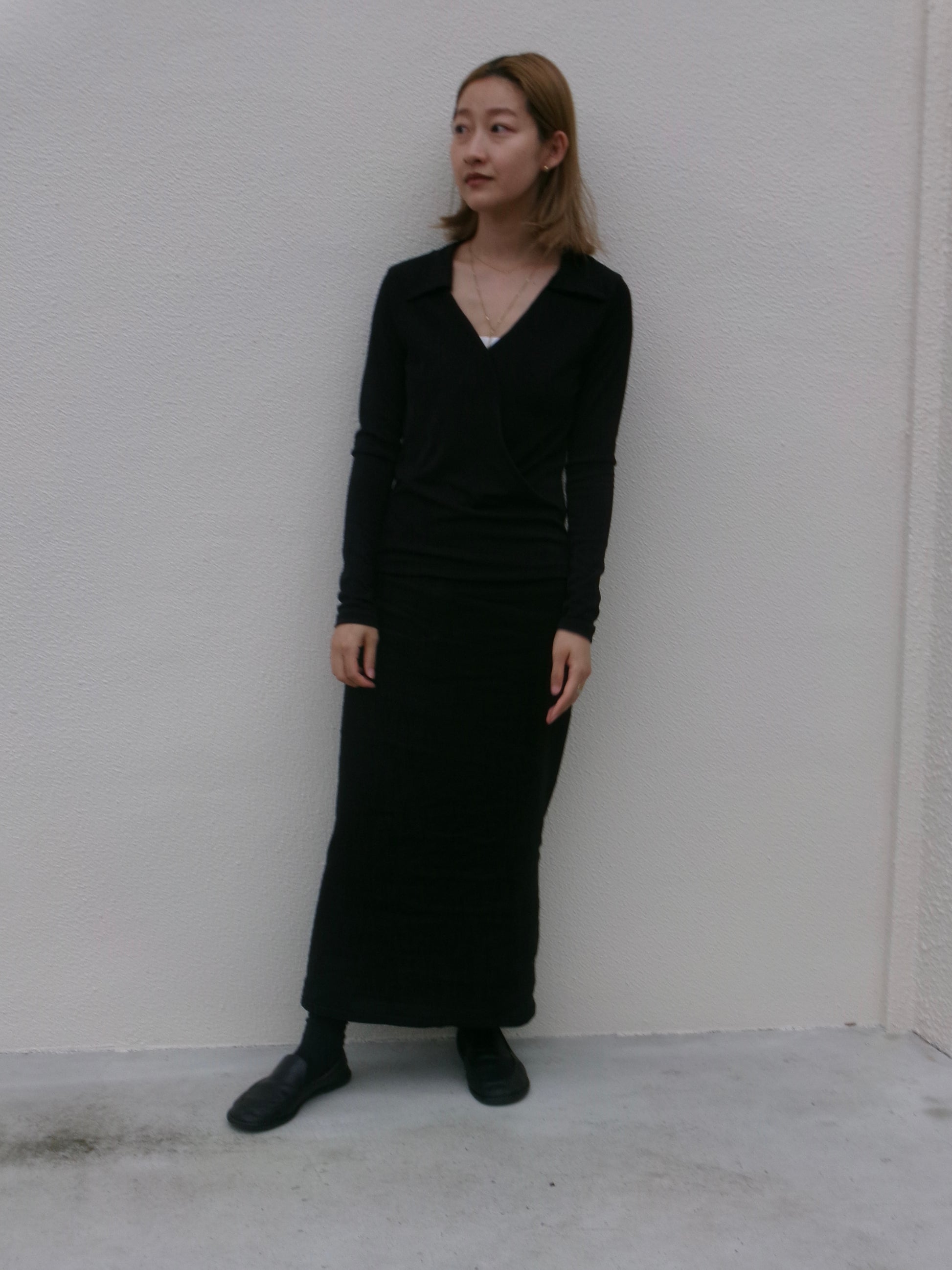 デコルテを美しく引き立てる、深めのVネックと、落ち感の美しいドレープを特徴としたラップデザイントップス。しなやかな素材とさりげなく個性を加えるツイストされた襟元と小さな襟が、シンプルながらも洗練された印象を与えます。デニムでもスカートでも合わせやすく、シーズンレス、オケージョンフリーに楽しんでいただけるトップスです。