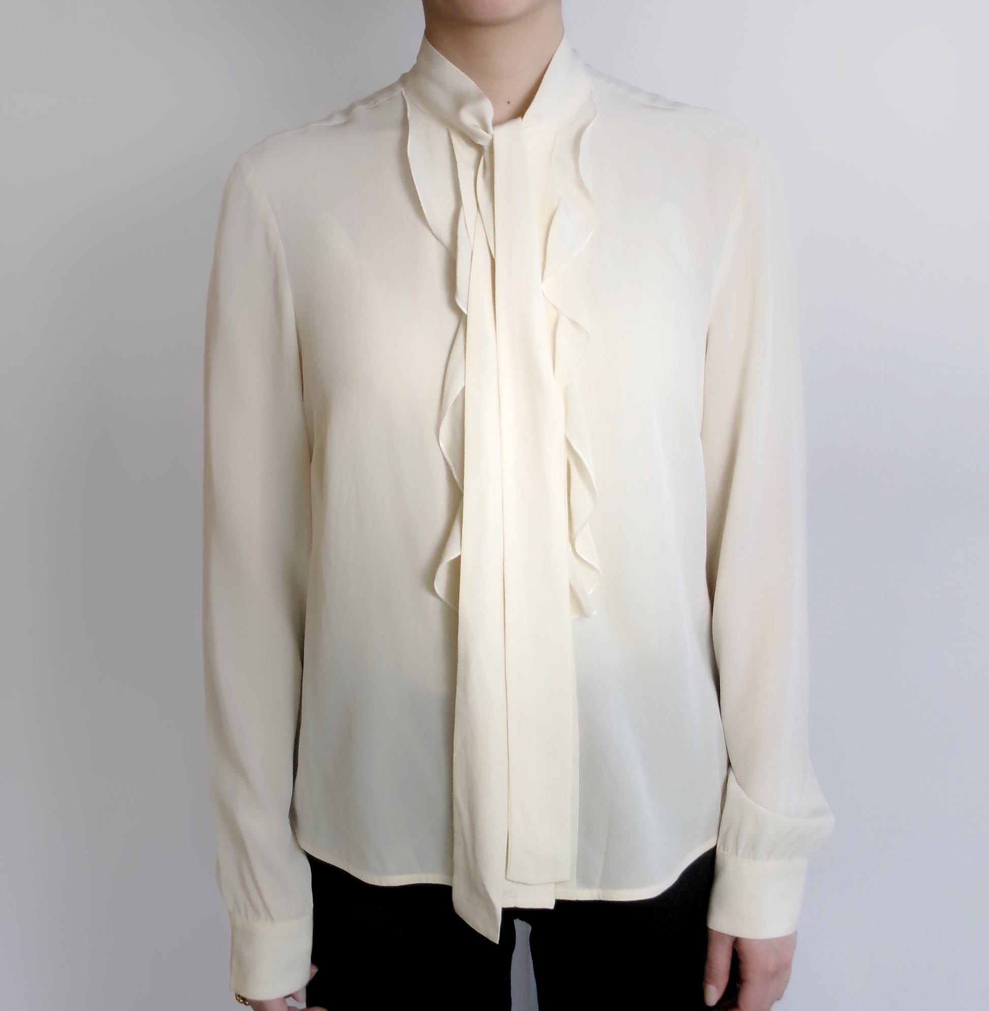 100% シルク素材シャツ。valentino のビンテージです。触り心地、着心地、動きやすさ、タイの汎用性も含め、パーフェクトなブラウスです。ビジネスやフォーマルなシーンはもちろん、デニムやリネン、コットンなどの異素材を合わせてカジュアルにスタイリングしても素敵なアイテムです。