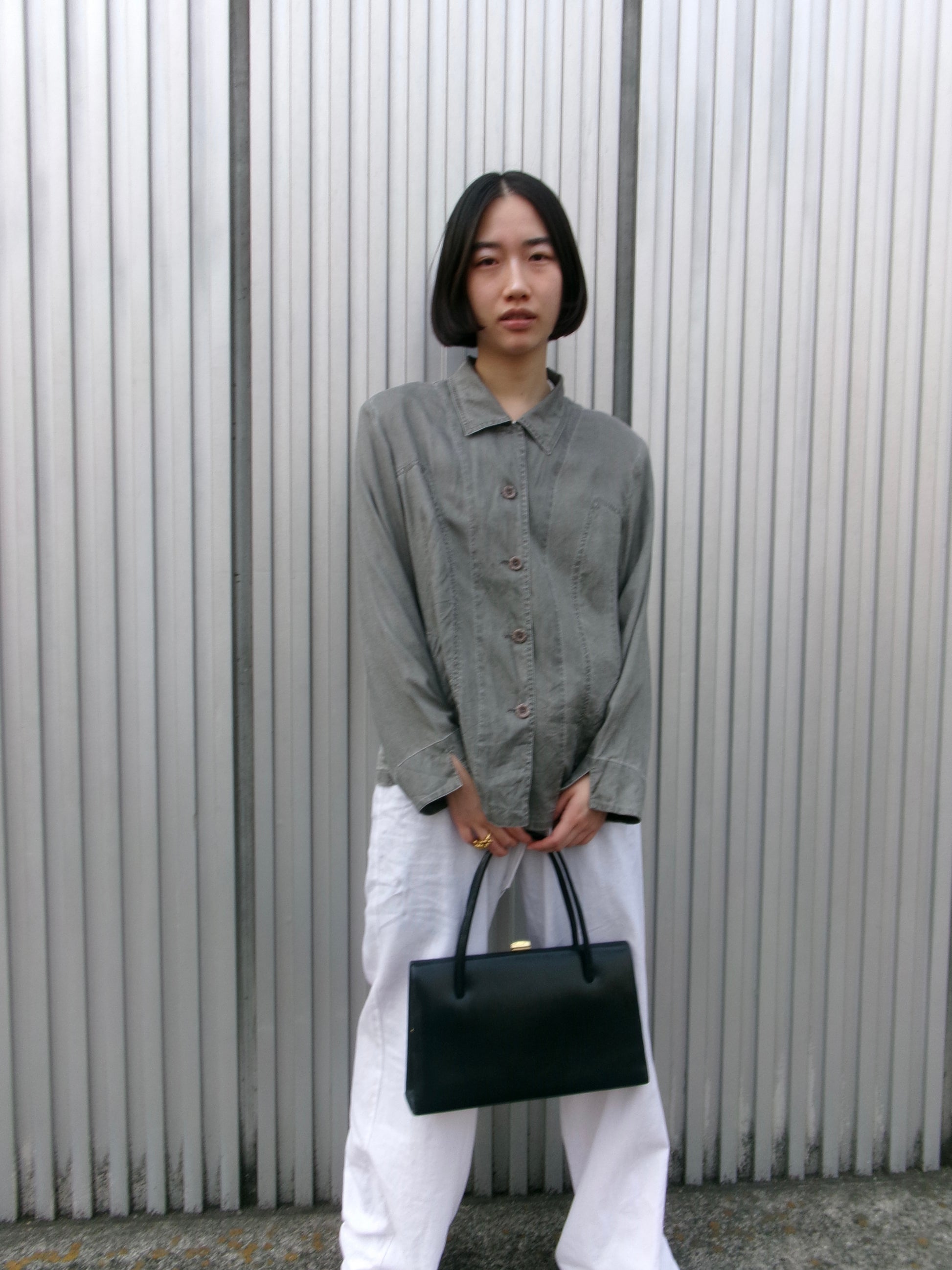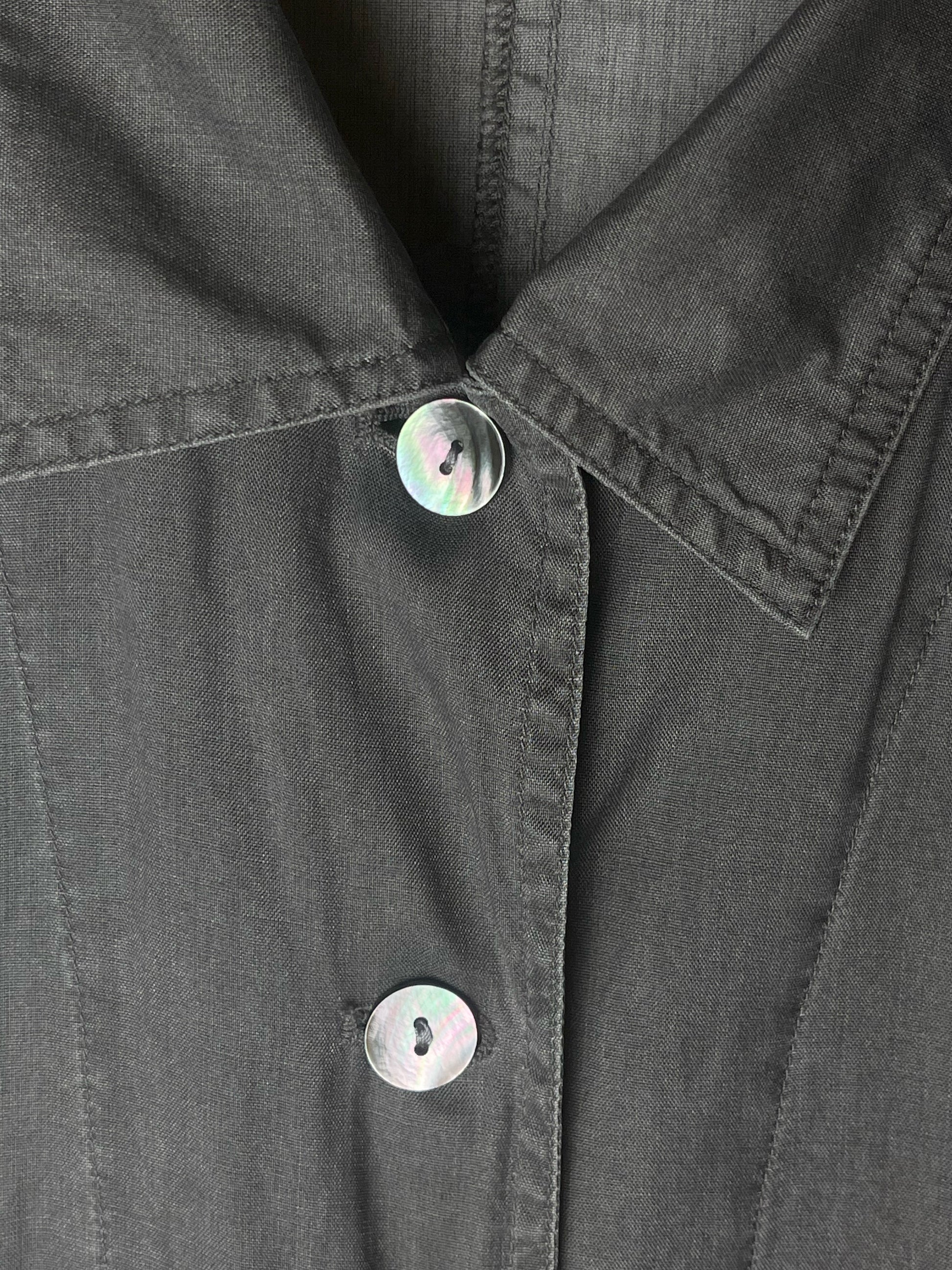 上質な100% シルクシャツのため、肌に触れるたびに心地よいアイテム。洗練された佇まいの中にリラックス感を忍ばせながらも、程よいショルダーパッドのコントラストが唯一無二なアイテムです。両サイドのポケットや手元のスリット、構築的な魅力をひきたてるフロントのブロッキングスティッチなどディティールが施されております。一枚で着ても、羽織としても。日常に上品な余白をもたらす一着です。買い付け時よりボタンが一つ欠けていたため、or studio にて黒蝶貝のシェルボタンへ付け替えさせていただいております。一つずつ違った個性を持つシェルボタンの佇まいもお楽しみいただけます。(元々ついていたボタン合計4つもご一緒にお送りさせていただきます。新たな出会いへ昇華いただけましたら嬉しいです。)