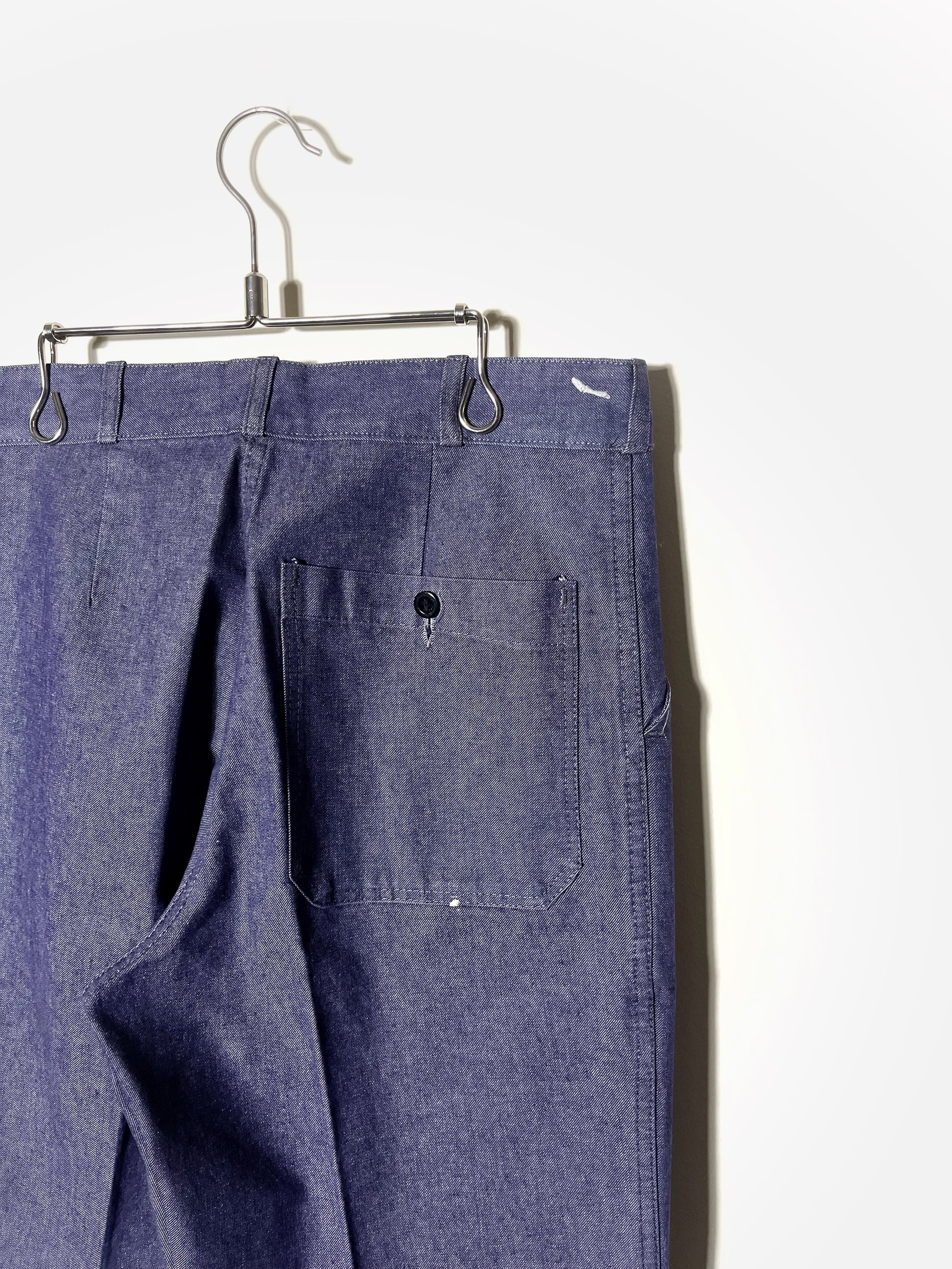 フランス軍で支給されていたデニムパンツ。ハリのある硬めのデニム素材でありながら、ワイドなスラックスシルエットのため、上品な着こなしが可能。フロントの1タックやジップフライ仕様、適度な太さと洗練された佇まいが魅力です。元々はメンズ向けのアイテムのため、高身長の方、細身のメンズの方にも手に取っていただけるアイテムです。