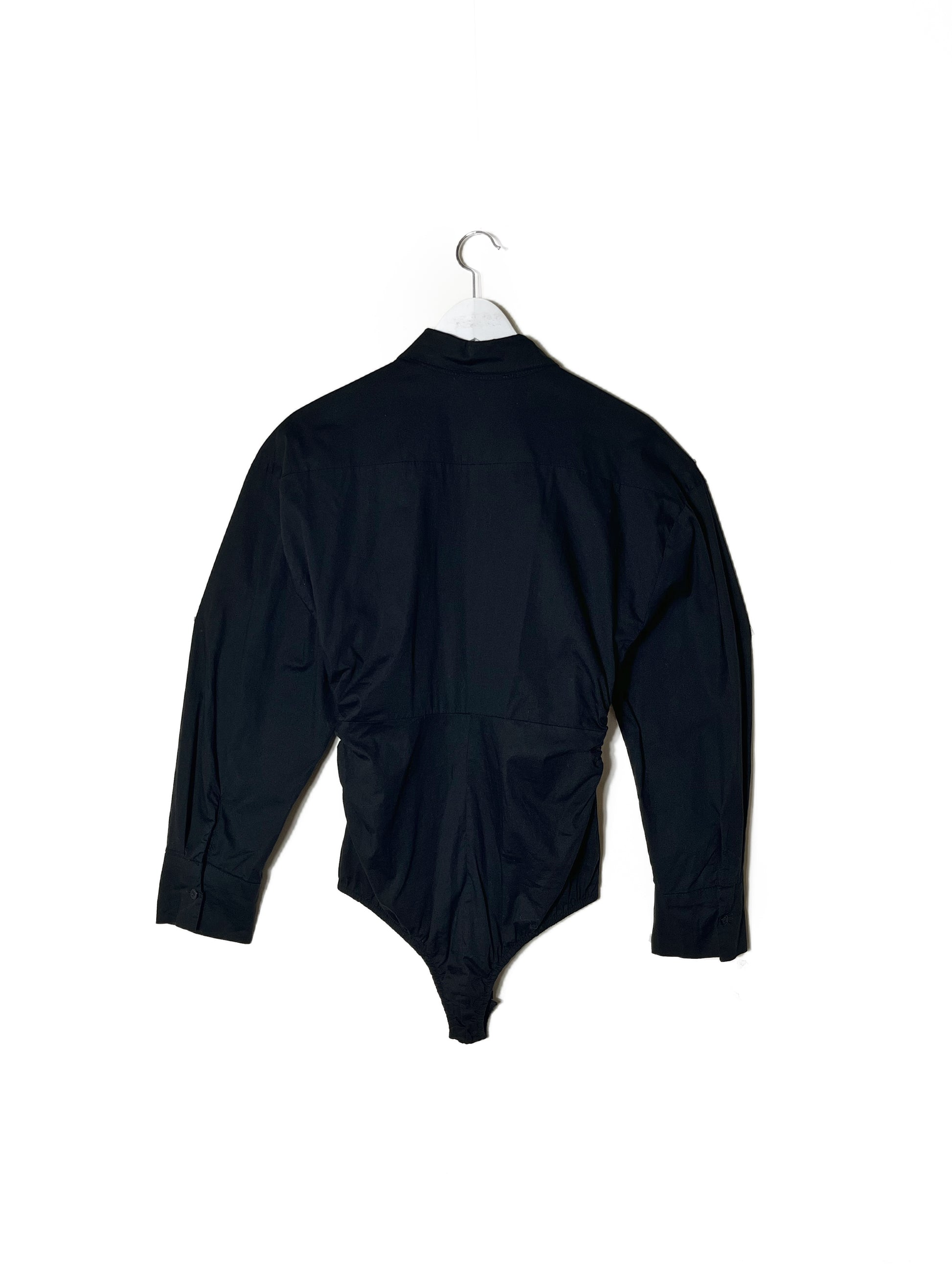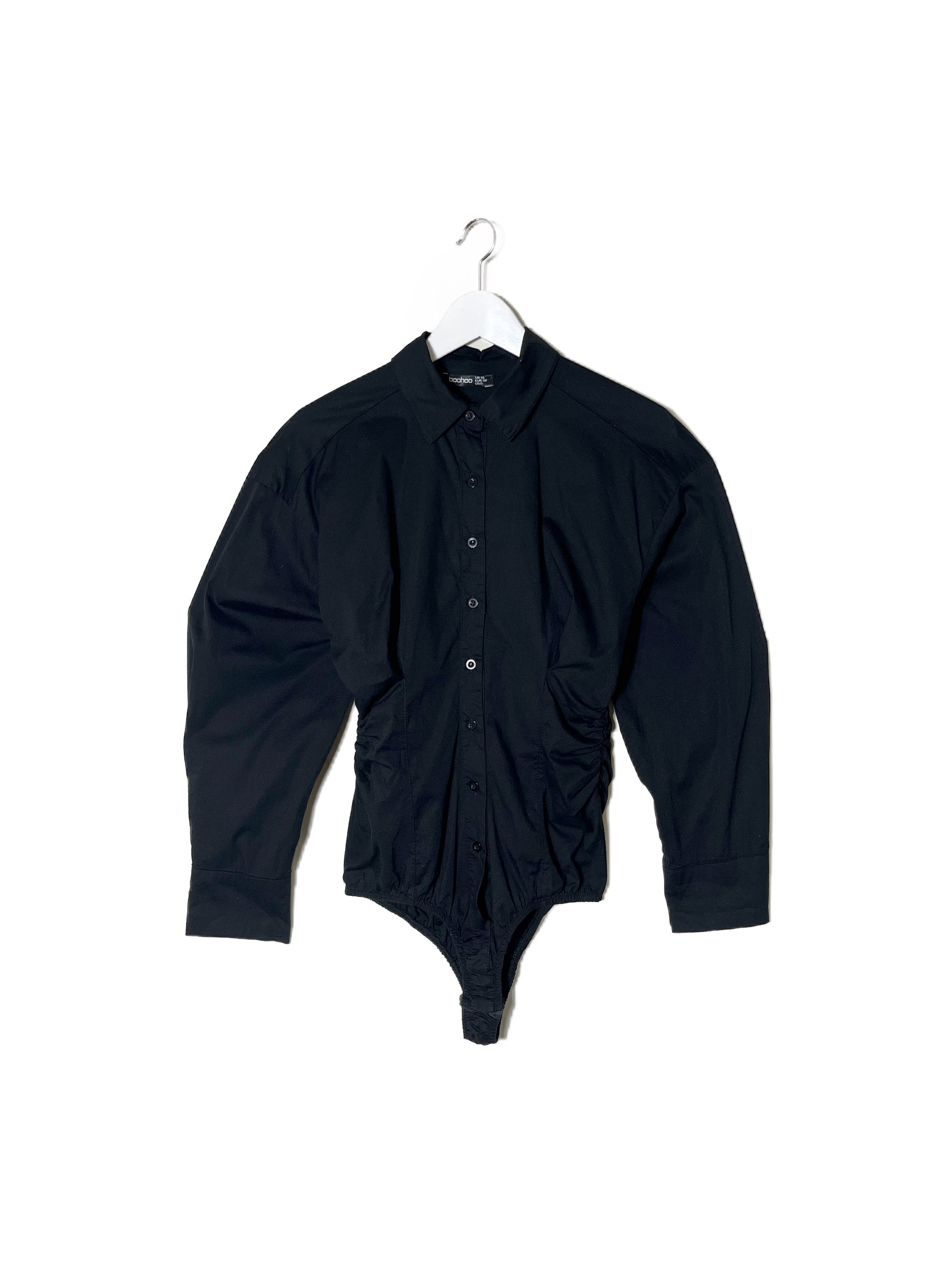 ウエストサイドにギャザーが施されたブラックシャツボディスーツ。ボディスーツタイプになっており、かつウエストサイドがギャザー(ゴム製)になっているので、腰回りが一切もたつかず、ウエストシェイプを美しく見せてくれます。
